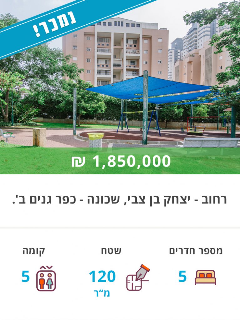 פרטי הנכס תאור הנכס דירת 5 חדרים +חצי חדר ממ"ד (משמש כחדר ארונות) – 125 מטר בנוי נטו.בניין מטופח ברחוב בן צבי המבוקש, רחוב שקט באזור כפר גנים ב'. הדירה מרווחת ושמורה. יש מעלית, חניה בטאבו ומרפסת שמש עורפית. לדירה נוף פתוח ועוצר נשימה לכיוון 471. האזור מקסים לגידול ילדים ושקט כאחד, בקרבת כל היציאות מהעיר.עסקה שלא תראו […]
